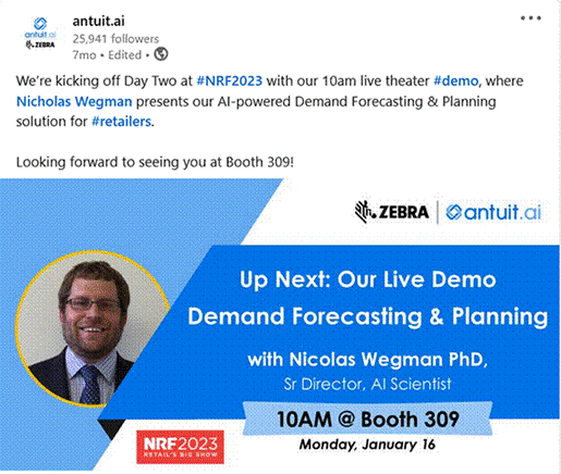 Selected LinkedIn posts from Antuit.ai. I drafted the text, chose appropriate internal photos or stock images for accompanying banners, as applicable.